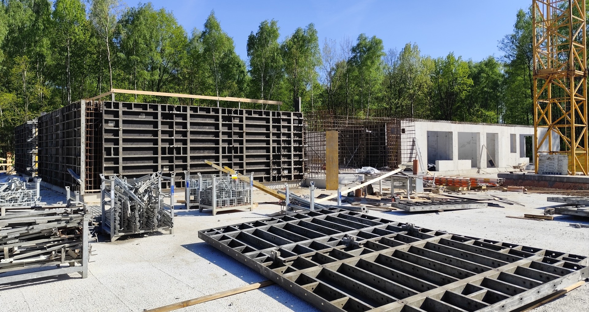 W budynku A realizowane są intensywne działania na poziomie parteru – obecnie trwa szalowanie, zbrojenie oraz wylewanie ścian kondygnacji.