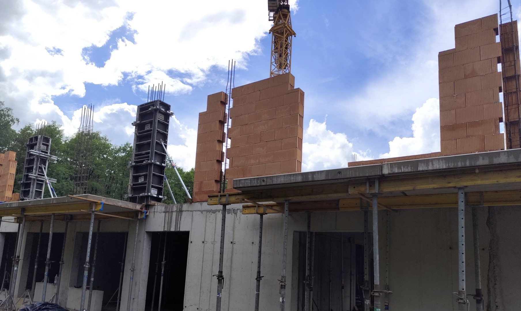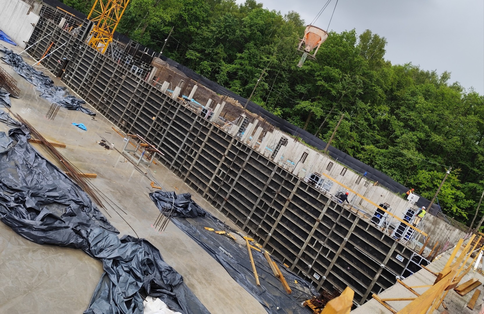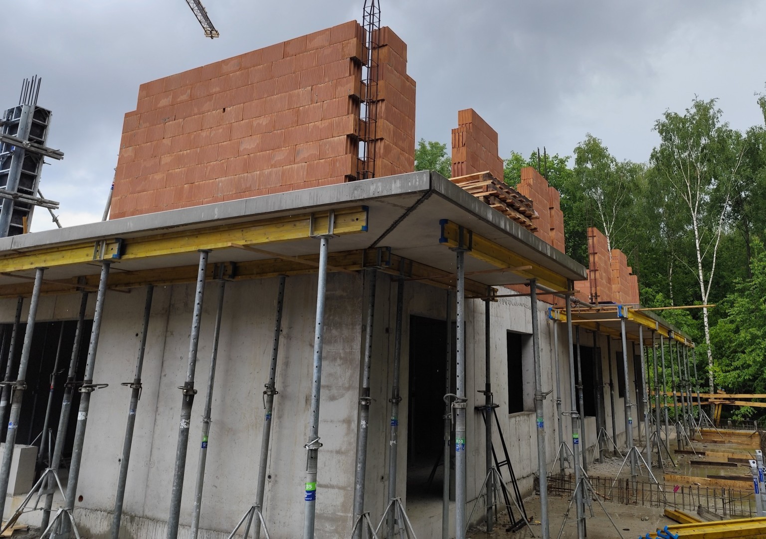 W obrębie budynku A ułożyliśmy strop z osadzeniem balkonów nad kondygnacją parteru. Obecnie prowadzimy prace murarskie na 1 piętrze wraz z jednoczesnym wykonywaniem rdzeni oraz ścian żelbetowych szybu windowego.