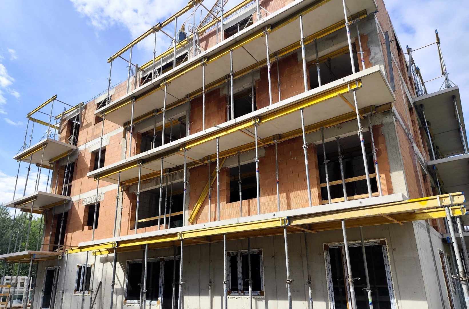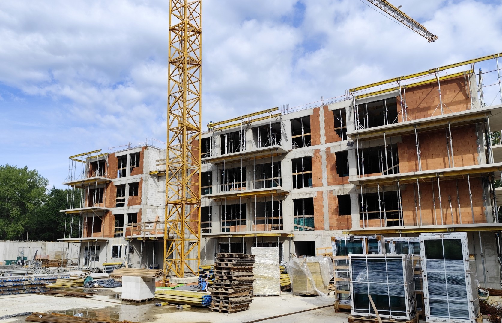 W budynku A ukończyliśmy już murowanie trzeciego piętra. Trwa montaż balkonów i układanie płyt stropowych nad trzecią kondygnacją, a równocześnie zbroimy strop. W międzyczasie na parterze pojawiły się pierwsze okna oraz ścianki działowe, a prefabrykowane schody prowadzące na trzecie piętro są już na swoim miejscu.