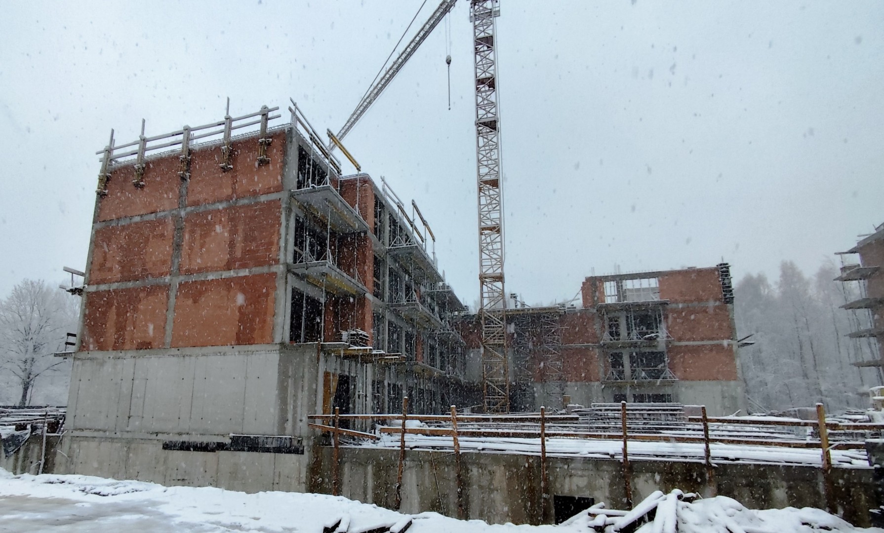Budynek A wznieśliśmy już do ostatniej kondygnacji wraz z murem attyki. Na dachu zostały wymurowane kominy. Ekipa dachowców wykonuje izolację termiczną oraz przeciwwodną dachu, kominów i ścian attyki. Domontowaliśmy okna na kolejnym 4 piętrze budynku. Elektrycy wykonują swoją instalację już na 4 piętrze. Ekipa od wentylacji montuje już ostatnie kanały pionów systemów wentylacyjnych. Tynkarze przeskoczyli na pięto 2 oraz 3 pokrywając za sobą ściany warstwą tynku. Panowie od instalacji sanitarnych montują ostatnie odcinki pionów kanalizacyjnych oraz rur odprowadzających wodę z dachu.