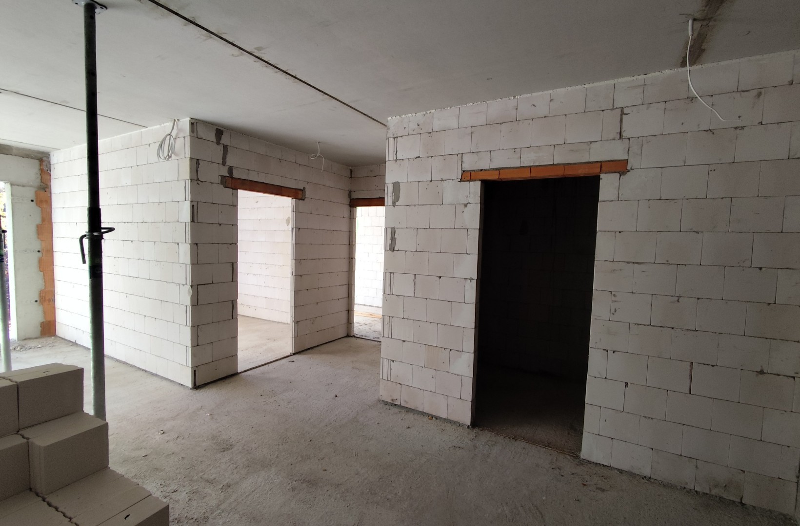 W budynku B trwa murowanie ścian nośnych z jednoczesnym wylewaniem rdzeni i nadproży na trzecim piętrze. Zostały również zamontowane prefabrykowane schody, które prowadzą już na drugie piętro. Dzięki temu komunikacja między kondygnacjami jest wygodniejsza, a prace mogą toczyć się sprawniej.