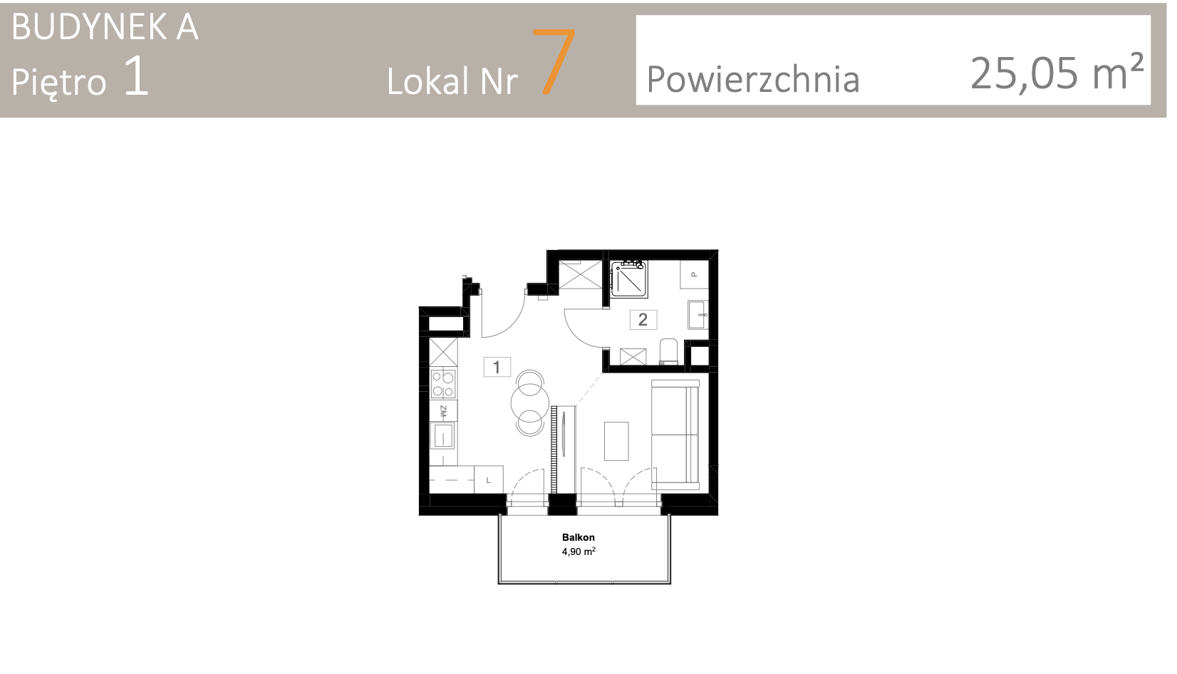 Mieszkanie A7 to komfortowe jednopokojowe mieszkanie z południową ekspozycją, co zapewnia dużo naturalnego światła i ciepła przez cały dzień. Panoramiczne, balkonowe okna otwierają przestrzeń na duży balkon o powierzchni około 4,90 m2, idealny do relaksu na świeżym powietrzu. Wnętrze mieszkania jest jasne i słoneczne, z możliwością wydzielenia strefy sypialnianej, co czyni przestrzeń bardziej wszechstronną. Duża łazienka zapewnia komfort, a widok z okien na teren osiedla, drogę osiedlową i blok naprzeciwko dodaje uroku codziennym chwilom.