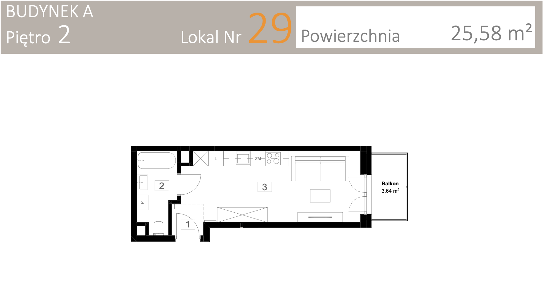 Mieszkanie A29 to idealne jednopokojowe mieszkanie z zachodnią ekspozycją, które jest jasne i słoneczne, a w lecie przyjemnie ciepłe (klimatyzacja jest zalecana). Duże balkonowe okno prowadzi na balkon o powierzchni około 3,64 m2, gdzie można cieszyć się popołudniowym słońcem. Przestrzeń mieszkania jest długa, co umożliwia wydzielenie poszczególnych stref, w tym strefy jadalnianej lub oddzielenie aneksu kuchennego wyspą. Łazienka o powierzchni około 5 m2 jest przestronna i funkcjonalna. Widok z okna obejmuje patio inwestycji oraz sąsiedni blok B, tworząc harmonijne otoczenie.